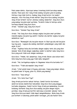 Dongeng anak yang berasal dari Filipina ini juga mengandung pesan moral agar putra-putri kita selalu menjadi pribadi yang rendah hati. Menyatakan makna perkataan frasa dan ayat. Setibanya di sungai Sang Arnab pula berada di atas Sang Kura-kura yang sedang berenang.